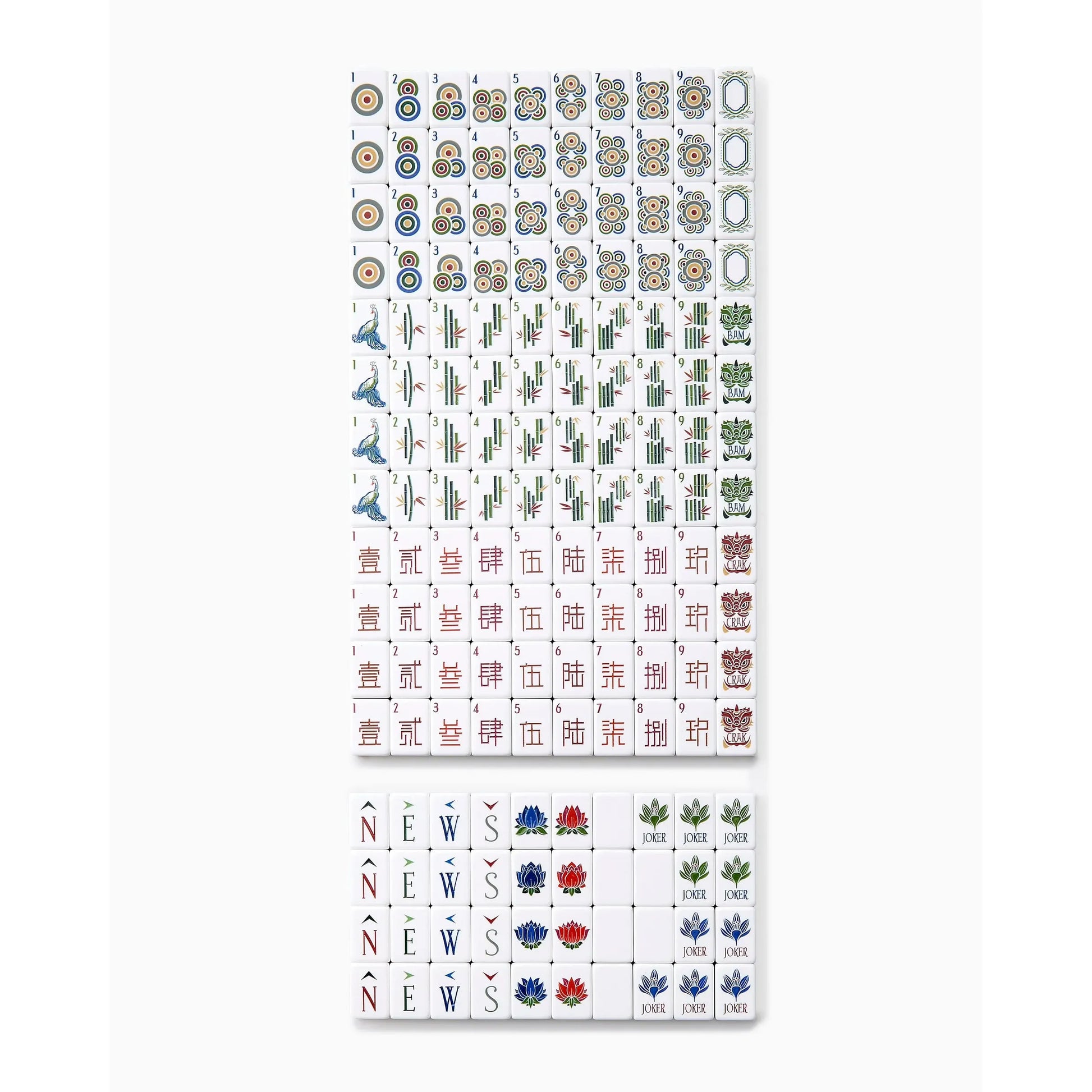 - 1–9 Bams, Cracks, Dots (4 each): 108 tiles